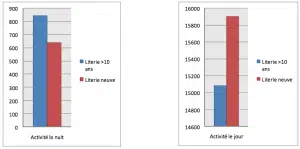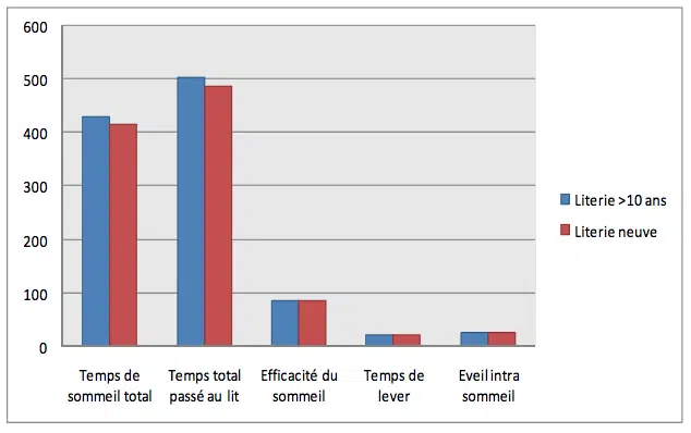 L’activité minimale durant la nuit est très nettement diminuée, les sujets ont un sommeil significativement plus calme avec une literie neuve c’est-à-dire une meilleure qualité de sommeil